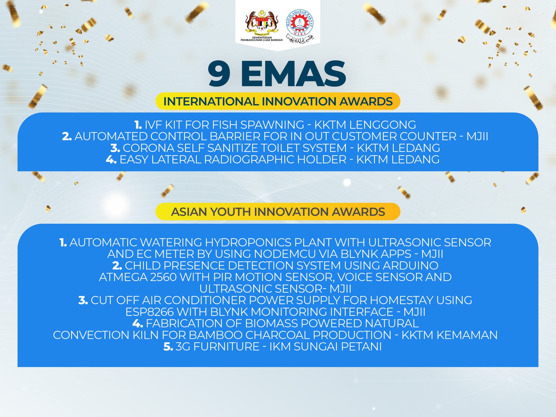 Pencapaian yang memberangsangkan serta membanggakan apabila pencipta inovasi dari TVET MARA menerusi Kolej Kemahiran Tinggi MARA (KKTM), MARA-Japan Industrial Institute (MJII) dan Institut Kemhiran MARA (IKM) telah berjaya mengetengahkan hasil ciptaan produk inovasi mereka yang berimpak global dan telah berjaya merangkul kejayaan amat bermakna pada pertandingan tersebut